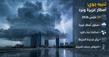| نهار غدٍ الثلاثاء 24 مارس | أبوظبي، منطقة الظفرة | أمطار غزيرة، بَرَد، انخفاض حرارة |