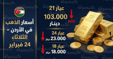 سعر الذهب في الأردن اليوم الثلاثاء 24-02-2026: انخفاض كافة الأعيرة والسبائك