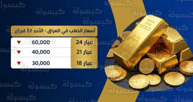 سعر الذهب في العراق اليوم الأحد 22-02-2026: تحديث أسعار عيار 21 والمثقال الآن