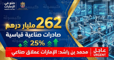 أعلنت دولة الإمارات العربية المتحدة اليوم عن تحقيق قفزة نوعية غير مسبوقة في قطاعها الصناعي، حيث سجلت الصادرات الصناعية الوطنية رقماً قياسياً تاريخياً بلغ 262 مليار درهم خلال العام الماضي، بنمو بلغت نسبته 25% مقارنة بالعام الأسبق، ويأتي هذا الإعلان ليتوج سلسلة من المبادرات الاستراتيجية التي أطلقتها الدولة لتعزيز مكانتها كمركز صناعي عالمي.
