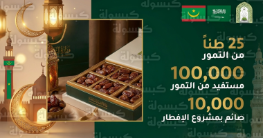 - توزيع التمور: شحن وتوريد 25 طناً من أجود أنواع التمور السعودية لتصل إلى 100 ألف مواطن موريتاني في مختلف الولايات.