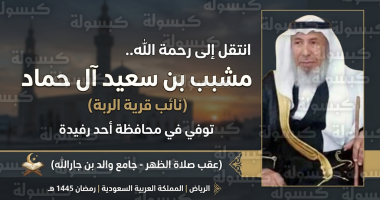 انتقل إلى رحمة الله تعالى، اليوم الأحد 22 مارس 2026 (الموافق 4 رمضان 1447هـ)، مشبب بن سعيد آل حماد، نائب قرية الربة التابعة لمحافظة أحد رفيدة، بعد مسيرة حافلة بالعطاء لخدمة أهالي منطقته. وسادت حالة من الحزن بين أهالي المحافظة فور إعلان الخبر، داعين الله له بالرحمة والمغفرة.