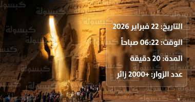 استقبلت مدينة أبو سمبل السياحية جنوب محافظة أسوان، فجر اليوم الأحد 22 فبراير 2026، واحدة من أعظم الظواهر الفلكية والهندسية التي عرفتها البشرية، حيث تعامدت أشعة الشمس على وجه تمثال الملك رمسيس الثاني في قدس الأقداس بمعبده الكبير، في مشهد مهيب استمر لعدة دقائق وسط ترقب عالمي.