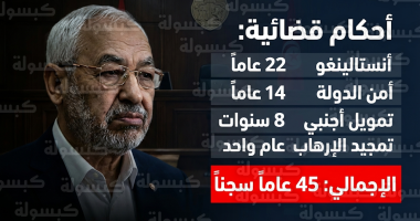 يواجه راشد الغنوشي حزمة من الأحكام الثقيلة التي صدرت بحقه في قضايا تمس الأمن القومي التونسي والنزاهة المالية. وبحسب آخر التحديثات القضائية حتى اليوم 26-2-2026، فإن إجمالي سنوات السجن الصادرة بحقه بلغت 45 عاماً، تتوزع بين قضايا التخابر، التمويل الأجنبي غير المشروع، والتحريض على العنف.