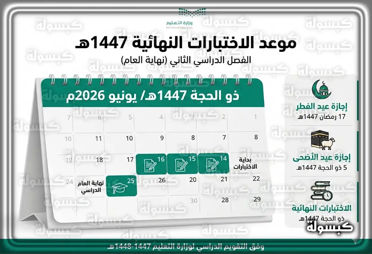 ينتهي العام الدراسي وتبدأ الإجازة الصيفية بتاريخ 25 يونيو 2026م (10 محرم 1448هـ).