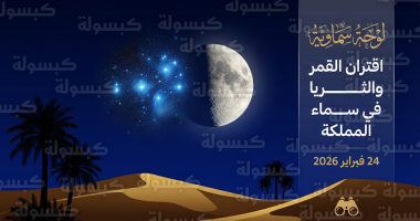 - سماء المملكة والوطن العربي تشهد مساء اليوم الثلاثاء 24 فبراير 2026 اقتراناً فلكياً بديعاً بين القمر وعنقود نجوم “الثريا”.